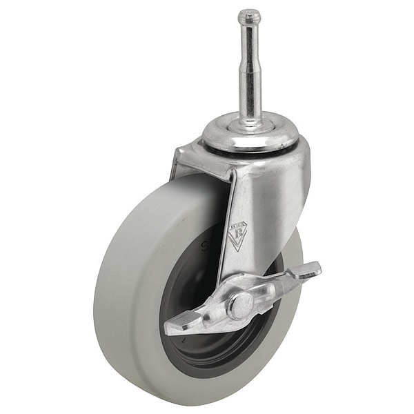 Stem Caster, Swivel Caster with Brake, 80 lb Load Rating, 0 to 299 lb, 2 in Wheel Dia., 13/16 in Wheel Width, Rubber Wheel/Tread Material, 2 5/8 in Mounting Height, Plain, 5/16 in x 1-1/2 in Caster Stem Size, Grip Neck, Steel Caster Frame Material, Zinc Plated Frame Finish, Yes Non-Marking, 1 Number of Wheels