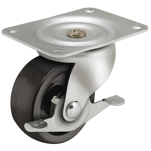 Swivel, Plate Caster, Load Rating 250 lb, Swivel Lock Type No Lock Included, Wheel Dia. 4 in, Wheel Width 1 3/8 in, Wheel/Tread Material Polyolefin, Wheel Core Material Polyolefin, Non-Marking Yes, Number of Wheels 1, Caster Brake Type Side Brake, Tread Shape Standard