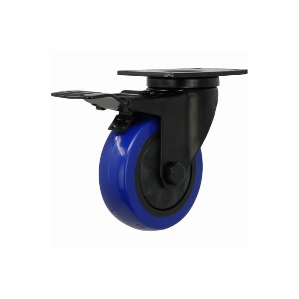 1 Pack, 4 in Diameter, Blue Diamond TPU Wheel Caster Features a foot activated total lock break that simultaneously stops the caster wheel rotation and swivel Double ball bearing swivel, black powder coated rig, 258 in x 334 in plate mount and 300 lb load capacity Offers soft and resilient nonmarking blue TPU wheels for quiet and smooth rolling over most surfaces Roller bearing sealed hubs for long term and trouble free performance