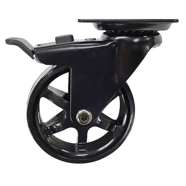 The Shepherd Hardware 3 inch mag Designer caster, with total locking brakes, adds bling with machined aluminum black finish and non-marking thermoplastic polyurethane treads.
