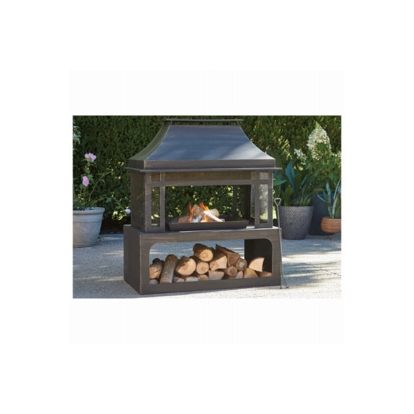 Four Seasons black all steel outdoor fireplace with slightly brushing golden paint Stylish log rack at the bottom of the unit Stable structure with great visual effects Comes with fire tool