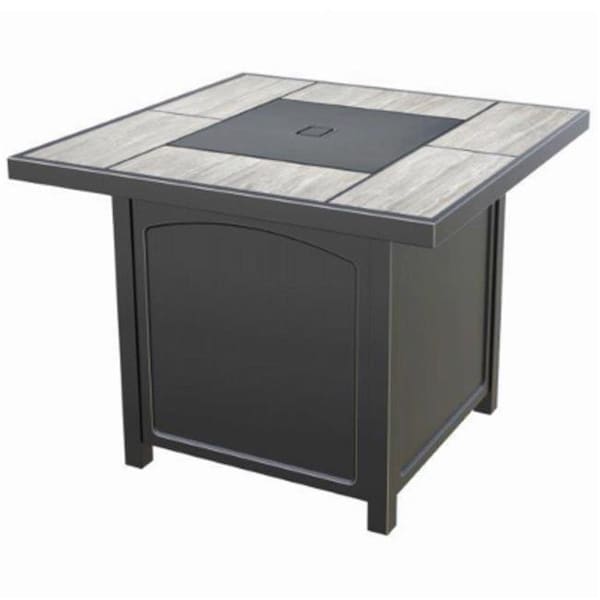 Four Seasons Courtyard 32" square tile tabletop gas fire pit. Has a 50,000 BTU output rate. Aluminum plated fire bowl with stainless steel burner. Steel cover lid easily changes this unit into a coffee table when not in use. Hinged door fits a 20 lb. propane tank inside the steel base. Integrated piezo ignition. Lava rocks are included. Propane tank not included.