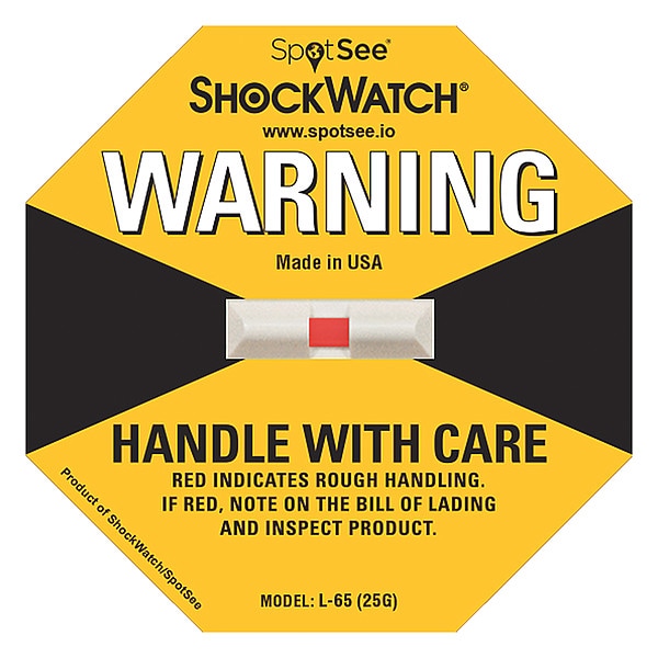 G-Force Indicating Label, Environmental Indicator Type Impact, Shock Indicator Type Shockwatch Indicator, Tilt Indicator Type Not Applicable, Resettable Not Resettable, Label Width 3 13/16 in, Label Height 3 13/16 in, Temperature Range -10 Degrees to 90 Degrees C, G-Force Sensitivity 25 g-force, Angle Sensitivity Not Applicable, Adhesive Material Acrylic, Shelf Life 2 yr, Status When Shipped Live, Language English, Package Quantity 50
