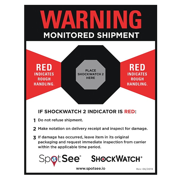 Shock Indicating Label, Shock Indicator Type Shockwatch Indicator Companion, Tilt Indicator Type Not Applicable, Resettable Not Resettable, Label Width 5 3/4 in, Label Height 4 1/2 in, Temperature Range -10 Degrees to 90 Degrees C, Angle Sensitivity Not Applicable, Adhesive Material Acrylic, Shelf Life 2 yr, Status When Shipped Armable, Language English, Package Quantity 200