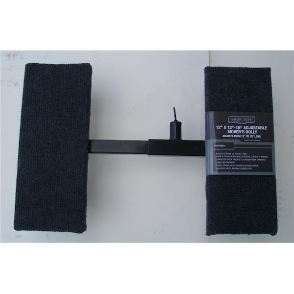 Shop Tuffs 12 x 12-18 Adjustable Movers Dolly allows you to easily move those loads that are too heavy to be carried by hand. Moving heavy loads is not a problem for this Shop Tuff product. With a high weight capacity, a durable hard-wood frame, and a carpeted deck, this dolly is ideal for any heavy job. The four 3 propylene casters all swivel, making moving your loads a breeze. Adjust the size of the dolly easily with the spring-loaded pin, which makes the dolly the perfect fit for a wide variety of jobs. Collapsed, the dolly measures 12 X 12, but the spring-loaded pin allows the dolly to adjust from 12 x 12 to 12 x 18, which makes the dolly the perfect fit for a wide variety of jobs. This Shop Tuff dolly will get the job done safely and efficiently. 1 year limited Manufacturers parts Warranty.