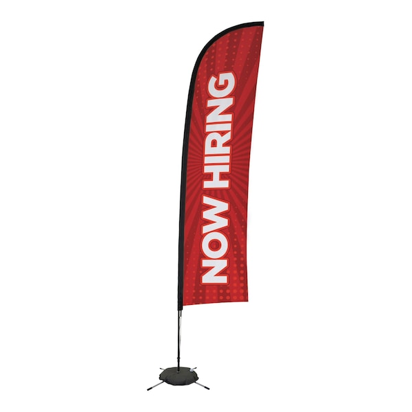 Announce to all that you're business is "Hiring" with this eye-catchy sign and graphic. The artwork will be dye sublimated on super poly knit fabric. Flag is reinforced with nylon webbing pole pockets. Flag attaches to a fixed hook using a bungee cord. Uniform carbon composite overlay pole construction with high-gloss black paint finish. Polished aluminum collar pole segment ends and ergonomic, rubber-reinforced base grip. Steel scissor base supports sail sign flag hardware, includes water ballast.