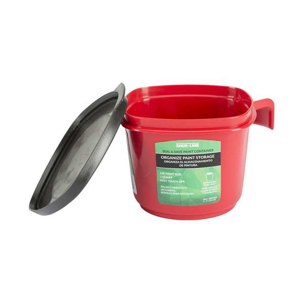 Paint Pail, Bucket Type Paint Handheld Cups, Capacity 1 qt, Material Plastic, 4 3/8 in Overall Depth, 6 in Overall Length, 7 1/4 in Overall Width, 4 3/8 in Overall Height, Color Red, For Use With Water Based Paints and Stains, Includes Air Tight Lid, Lid Included Yes, Reusable Yes, Sub Brand Shur-Line