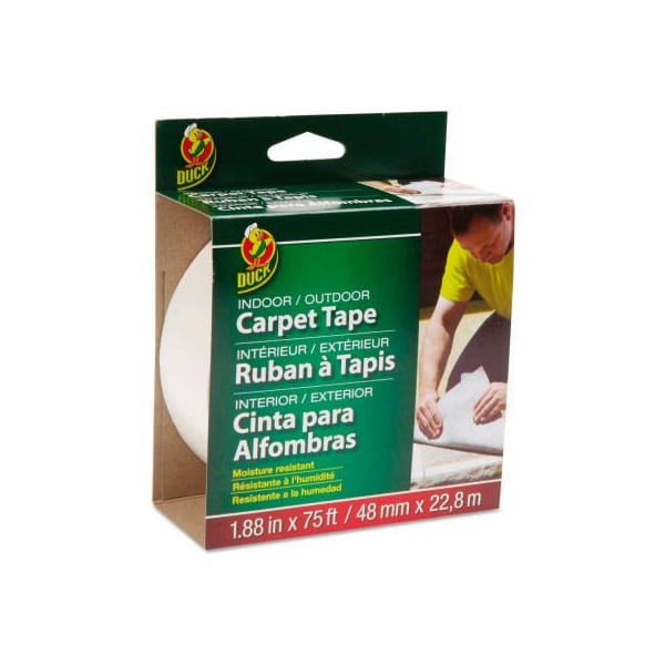 Duck carpet tape, 1.88" x 75ft, 3" core duck carpet tape is mildew- and moisture-resistant for high-traffic areas where dampness may be present, such as bathrooms and basements. Double-sided with rubber adhesive. Duck carpet tape is 1.88" wide with a 6 mil. Thickness. larger quantity quotes available. Please call 1-888-978-7759. this product arrives to most customers in 2-3 business days.