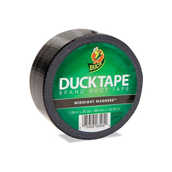 Duck colored duct tape, 1.88"w x 20 yds - 3" core - black great for decorating and craft applications. Can also be used for color coding, identification and general repairs. Waterproof and tear-resistant with high-performance strength and adhesion. Super thick hot melt adhesive applied to a cotton mesh reinforced waterproof cotton backing for extra strength and cross tear-ability. tape type: duct tape width: 1-7/8" tape length: 15 yards core size: 3" thickness: 9 mil larger quantity quotes available. Please call 1-800-645-1232. this product arrives to most customers in 2-3 business days.