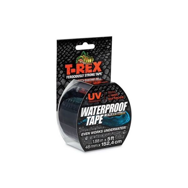Strong waterproof tape provides tough waterproof adhesion under wet and dry conditions. Built with R-Flex Technology, T-REX waterproof tape can stretch up to 700% of its original length. It's strong enough to be used for general purpose indoor or outdoor fixes that require a waterproof seal, like repairing a rip in an above-ground pool or temporarily stopping a leak in a water pipe. Apply it underwater and push it into cracks and rough, dirty surfaces. Formulated to withstand extreme temperatures from -70F to 200F, its UV-resistant formulation won't break down under harsh sunlight. Grade: Medium-Duty; Core Size: 3in; Dispenser Included: No; Adhesive Material: Butyl.