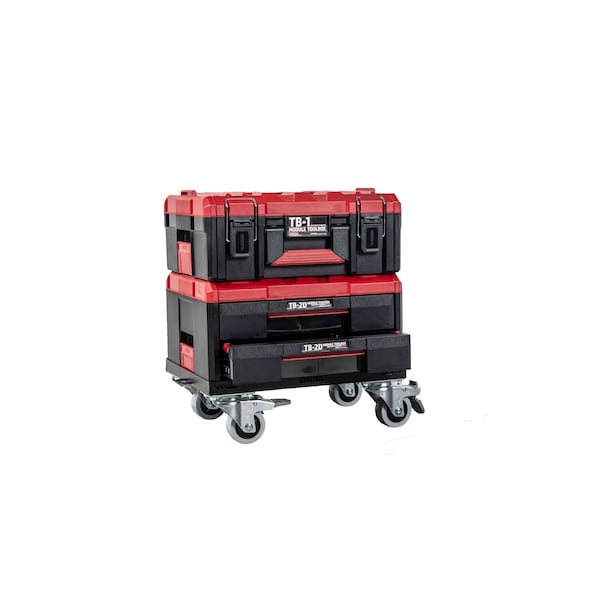Shuter Mobile Toolbox Stackable Kit includes TB-1 and TB-2 toolboxes. (TB-1) w/ tray, ABS high rigidity anti-impact design, Quick Release Side Latch, Dual handles top and side, (TB-2D) w/ (2) Drawers, Ball bearing drawer slides built for heavy loads, ABS high rigidity anti-impact design , Dividers and EVA Pad, Mobile Base for Stackable Tool Boxes (TB-1 ~ TB-2D) 3in Polypropolene Industrial swivel - braking Casters. Load capacity 300 lbs