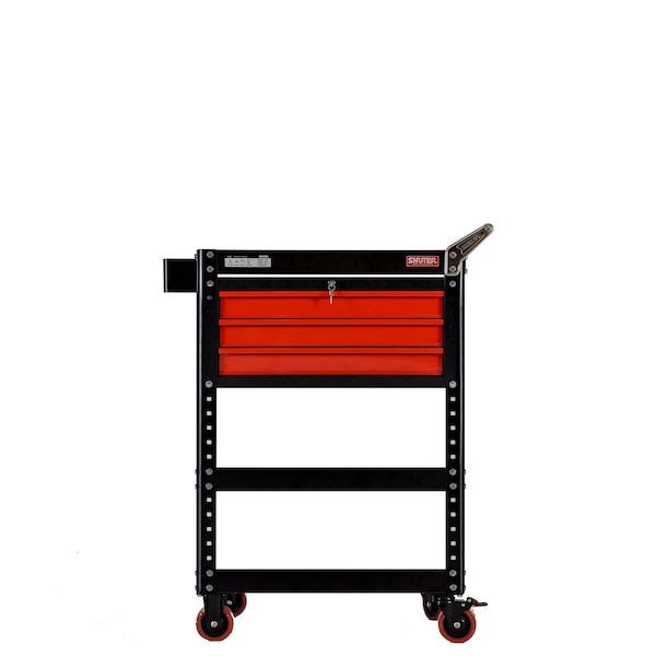 SHUTER hand-carts have been developed for the transport and storage of materials used in manufacturing, and over the years, our designs have been improved to guarantee that they meet the high standards of strength and durability needed in factory or production settings. Unique features are (3) Modular Drawers and (4) Steel Shelves. Other key features include , 4 inTPR noiseless casters (2 fitted with brakes), square pegboard to hang tools and accessories and a steel handle for easy move-ability. (3) Modular Drawers which include square bins in the first drawer for better tool organization and storage. Modular drawers are lockable to keep your valuable tools safe including the built in stoppers to keep drawers from falling out. (4) Steel shelves for storage of tools and components High quality powder coated 1.2 mm thick galvanized steel.Compact cart height of just under 1 meter: suitable for smaller workspaces. Knock-down design for space-saving flat-packed product shipping. Each shelf can support weights of up to 220 lbs. (Total cart capacity product weight limit is 800 lbs.