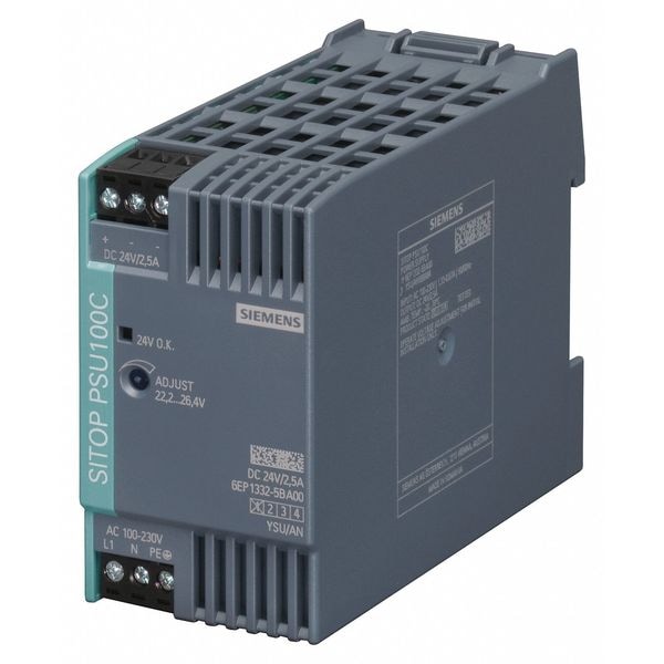 DC Power Supply, Input Voltage 100 to 230V AC, 110 to 300V DC, Output Voltage 24V DC, Power Rating 60W, Output Amps 2.5, Mounting DIN Rail, Switching, Case Material Plastic Case, Height 80 mm, Width 45 mm, Depth 100 mm, Series SITOP PSU100C, Hz 50 to 60 Hz, Phase - Electrical Single, Peak Amps 3, IP Rating IP20, Output Noise 200/55mV, Hold Up Time Greater Than 20 msec, Status Indicator Green LED OK Signal, NEMA Rating 1, Operating Temp. Range -20 Degrees to 70 Degrees C