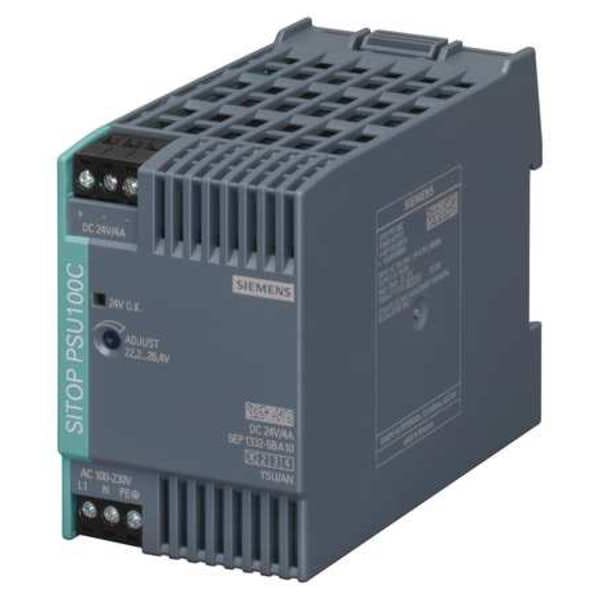 DC Power Supply, Input Voltage 100 to 230V AC, 110 to 300V DC, Output Voltage 24V DC, Power Rating 96W, Output Amps 4, Mounting DIN Rail, Switching, Case Material Plastic Case, Height 80 mm, Width 52 mm, Depth 100 mm, Series SITOP PSU100C, Hz 50 to 60 Hz, Phase - Electrical Single, Peak Amps 4.8, IP Rating IP20, Output Noise 200/80mV, Hold Up Time Greater Than 20 msec, Status Indicator Green LED OK Signal, NEMA Rating 1, Operating Temp. Range -20 Degrees to 70 Degrees C