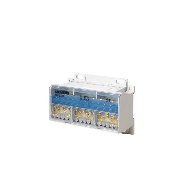 Distribution block 4-pole, 125 A, 690V Input: 1x 25/35 mm2 Output: 4x 16+7x 10 mm2 for installation on standard mounting rail