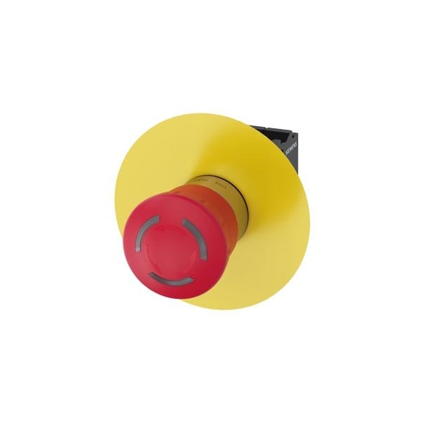 EMERGENCY STOP mushroom pushbutton, illuminable, 22 mm, round, metal, shiny, red, 40 mm, positive latching, according to DIN EN ISO 13850, rotate-to-unlatch, with yellow backing plate, without inscription, with holder, 1 NC, 1 NC, LED 24 V red, spring-loaded terminal, front plate mounting