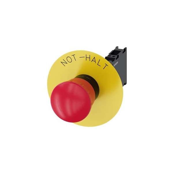 EMERGENCY STOP Mushroom-Type Actuator 22 mm, round, plastic, red, 40 mm, positive latching, according to EN ISO 13850, rotateto-unlatch, with yellow backing plate, inscription: NOT-HALT, with holder, 1 NO+1 NC, spring-type terminal
