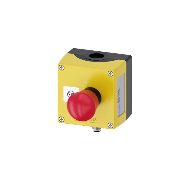 Enclosure for command devices, 22 mm, round, enclosure material plastic, enclosure top part yellow, 1 command point plastic, A=Emergency stop mushroom pushbutton red, 40 mm, rotate-to-unlatch, 2 NC, spring-type terminal, floor mounting, silver label, black font, with graphic symbol: EMERGENCY STOP, M12 connector 5-pole bottom, insulated reserve conductors Pin assignment: Pin1=21, Pin2=11, Pin3=n.c., Pin4=22, Pin5=12 Label enclosed