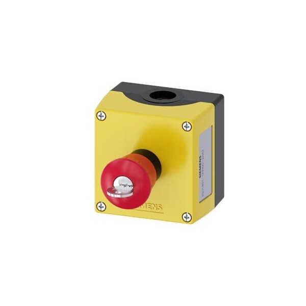 Enclosure for command devices, 22 mm, round, Enclosure material plastic, Enclosure top part yellow, 1 control point plastic, Control point in center, A=EMERGENCY STOP mushroom pushbutton red, 40 mm, with RONIS lock SB30, key-operated release, 1 NC, 1NO, screw terminal, floor mounting, 1xM20 each on top and bottom