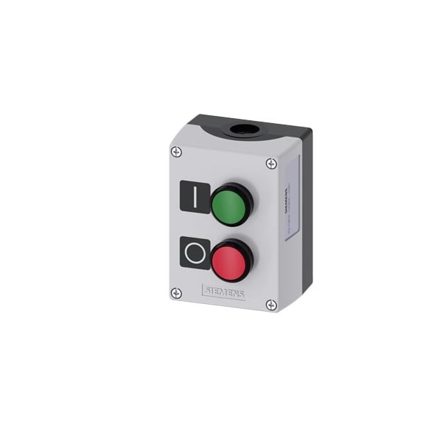 Enclosure for command devices, 22 mm, round, Enclosure material plastic, enclosure top part gray, 2 control points plastic, B=Pushbutton green, label: I, 1 NO, screw terminal, A=Pushbutton red, label: O, 1 NC, screw terminal, floor mounting, 1xM20 each on top and bottom, Labels enclosed