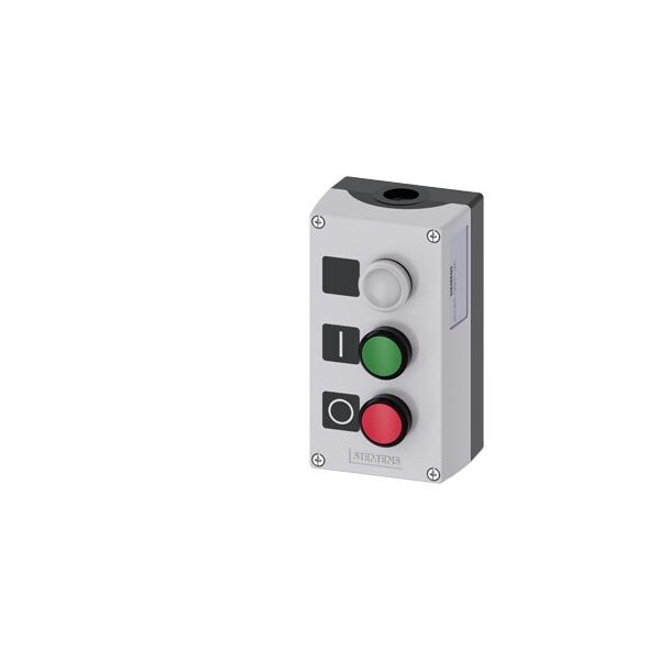 Enclosure for command devices, 22 mm, round, Enclosure material plastic, enclosure top part gray, 3 control points plastic, C=Indicator light clear, label LED 24 V, screw terminal, B=Pushbutton green, label: I, 1 NO, screw terminal, A=Pushbutton red, label: O, 1 NC, screw terminal, floor mounting, 1xM20 each on top and bottom, Labels enclosed