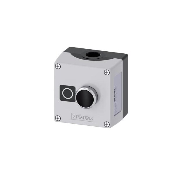 Enclosure for command devices, 22 mm, round, Enclosure material metal, enclosure top part gray, 1 control point metal, A=Pushbutton black, 1 NC, screw terminal, floor mounting, label: O, 1xM20 each on top and bottom, Label enclosed