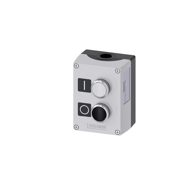 Enclosure for command devices, 22 mm, round, Enclosure material metal, enclosure top part gray, 2 control points metal, B=Pushbutton white, label: I, 1 NO, screw terminal, A=Pushbutton black,Label: O, 1 NC, screw terminal, floor mounting, 1xM20 each on top and bottom, Labels enclosed