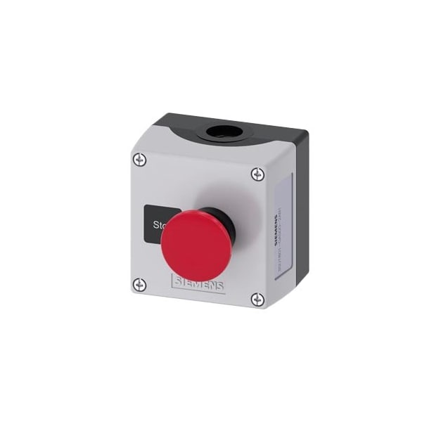 enclosure for command devices 22 mm, round, enclosure material plastic, enclosure top part gray, 1 control point, A=Mushroom pushbutton, red, 40 mm, momentary contact type, plastic, label: Stop, 1 NO, 1 NC, screw terminal, floor mounting, 1xM20 each on top and bottom Label glued in