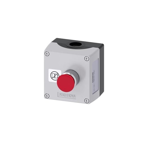 Enclosure for command devices 22 mm, round, enclosure material plastic, enclosure top part gray, 1 control point, A = Push-pull switch, red, metal, 30 mm, 1 NC, spring-type terminal, floor mounting, support terminal, customized label, top and bottom 1xM20 each, Label glued in