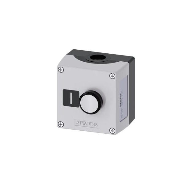 Enclosure for command devices, 22 mm, round, Enclosure material plastic, enclosure top part gray, 1 control point plastic, Recess for label, A=Pushbutton white, label: I, 1 NO, screw terminal, floor mounting, Label enclosed