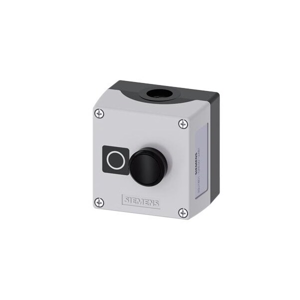 Enclosure for command devices, 22 mm, round, Enclosure material plastic, enclosure top part gray, 1 control point plastic, Recess for label, A=Pushbutton black label: O 1 NC, screw terminal, floor mounting, Label enclosed