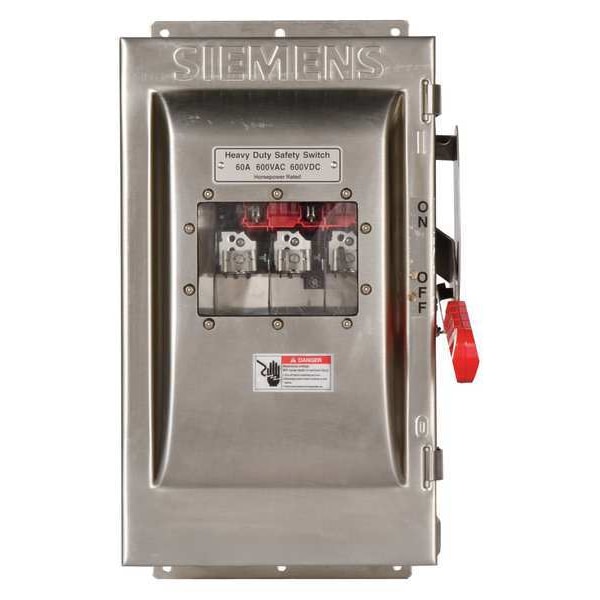 Safety Switch, Contact Form 3PST, Current Rating 60 A, Depth 8 3/8 in, Duty Heavy Duty, Enclosure Type Enclosed, Environment Indoor/Outdoor, Features Viewing Window, For Fuse Class Class H, Class J, Class K, Class R, Height 17 1/2 in, Horsepower @ 600V AC 50 hp, Housing Material 304 Stainless Steel, IP Rating IP20, Mounting Style Surface Mount, NEMA Enclosure Rating 4, 4X