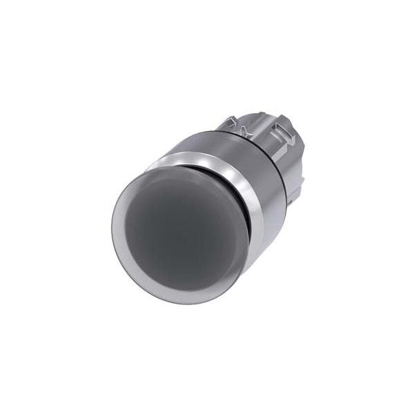 Illuminated mushroom pushbutton, 22 mm, round, metal, shiny, clear, 30 mm, latching, pull-to-unlatch mechanism, with laser labeling, upper case and lower case, always upper case at beginning of line