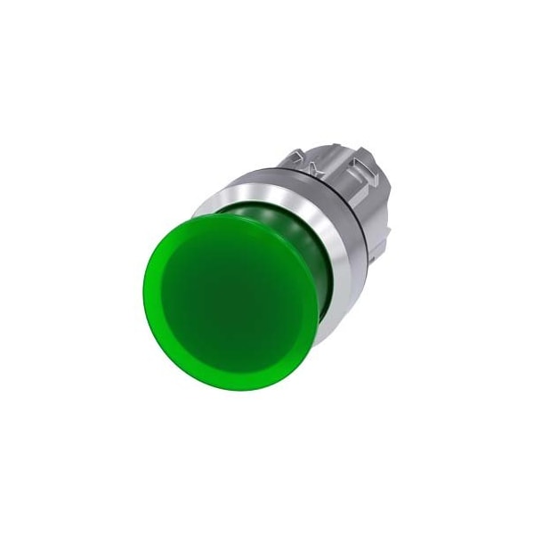 Illuminated mushroom pushbutton, 22 mm, round, metal, shiny, green, 30 mm, momentary contact type, with laser labeling, upper case