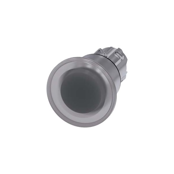 Illuminated mushroom pushbutton, 22 mm, round, metal, shiny, clear, 40 mm, latching, pull-to-unlatch mechanism, with laser labeling, upper case and lower case, always upper case at beginning of line