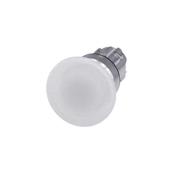 Illuminated mushroom pushbutton, 22 mm, round, metal, shiny, white, 40 mm, momentary contact type, with laser labeling, upper case