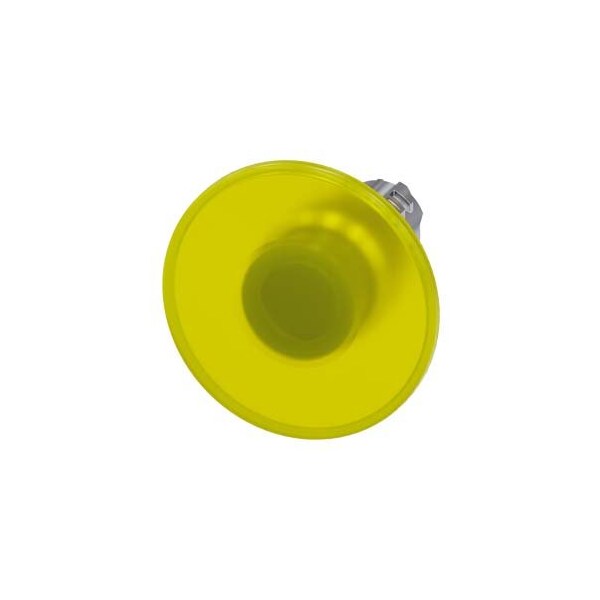 Illuminated mushroom pushbutton, 22 mm, round, metal, shiny, yellow, 60 mm, momentary contact type, with laser labeling, upper case and lower case, always upper case at beginning of line