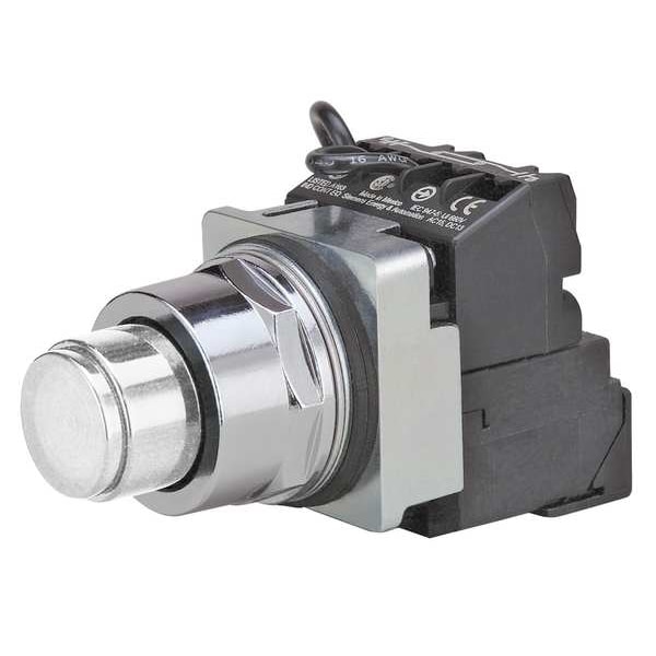 Illuminated Push Button, 30 mm, Momentary Action, Round Button Type of Operator, Head Material Plastic, Contact Form 1NO/1NC, Bezel Chrome Plated Zinc Die Cast, Color White, Contact Rating 10A @ 600V AC, NEMA Contact Rating Designation A600/P600, Number of Operators 1, NEMA Rating 1, 12, 13, 3, 3R, 4, 4X, IP Rating IP20, IP66, Legend Not Applicable, Standards CSA, REACH, UL Listed, Terminal Connection Screw