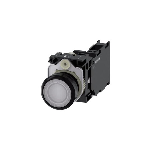 Illuminated pushbutton, 22 mm, round, plastic, white, pushbutton, flat, momentary contact type, with holder, 1 NO+1 NC, LED module with integrated LED 110 V AC, spring-type terminal, with laser labeling, upper case