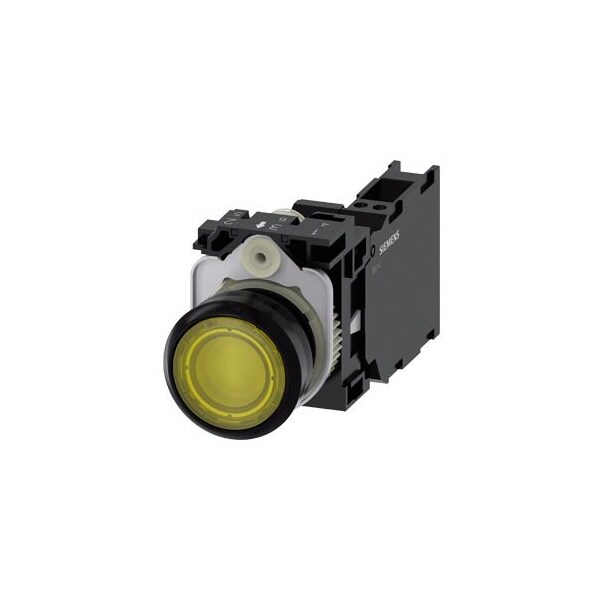 Illuminated pushbutton, 22 mm, round, plastic, yellow, pushbutton, flat, momentary contact type, with holder, 1 NO+1 NC, LED module with integrated LED 230 V AC, spring-type terminal, with laser labeling, symbol number according to, ISO 7000 or IEC 60417