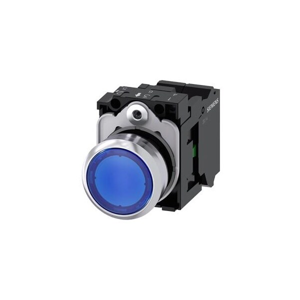Illuminated pushbutton, 22 mm, round, Metal, shiny, blue, pushbutton, flat, momentary contact type, with holder, 1NO, LED module with integrated LED 230 V AC, spring-type terminal, with laser labeling, upper case and lower case, always upper case at beginning of line