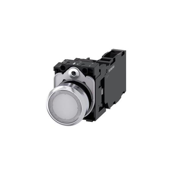 Illuminated pushbutton, 22 mm, round, Metal, shiny, white, pushbutton, flat, momentary contact type, with holder, 1 NO+1 NC, LED module with integrated LED 230 V AC, screw terminal, with laser labeling, upper case and lower case, always upper case at beginning of line