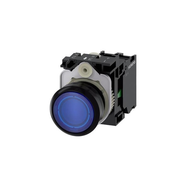 Illuminated pushbutton, 22 mm, round, plastic, blue, pushbutton, flat, momentary contact type, with holder, 1 NO, LED module with integrated LED 24 V AC/DC, screw terminal