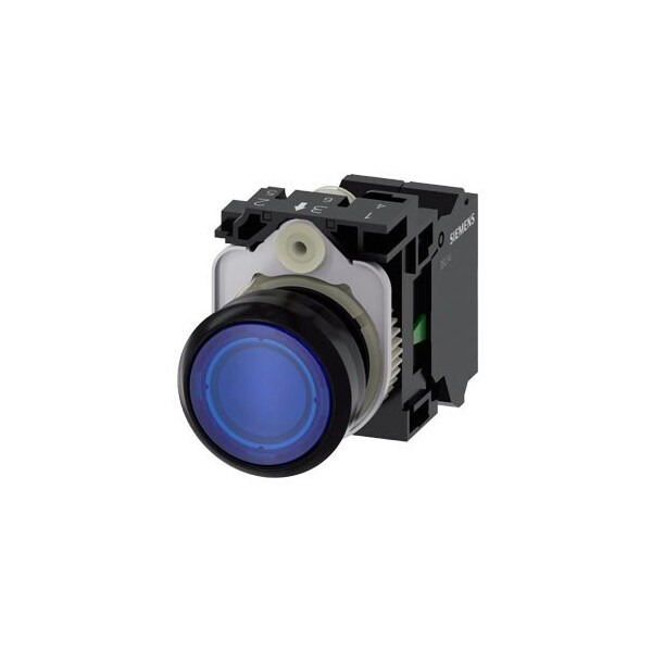 Illuminated pushbutton, 22 mm, round, plastic, blue, pushbutton, flat, momentary contact type, with holder, 1 NO, LED module with integrated LED 24 V AC/DC, Spring-type terminal