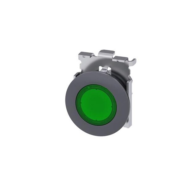 Illuminated pushbutton, 30 mm, round, metal, matte, green, front ring for flush installation, latching, Push-to-release mechanism