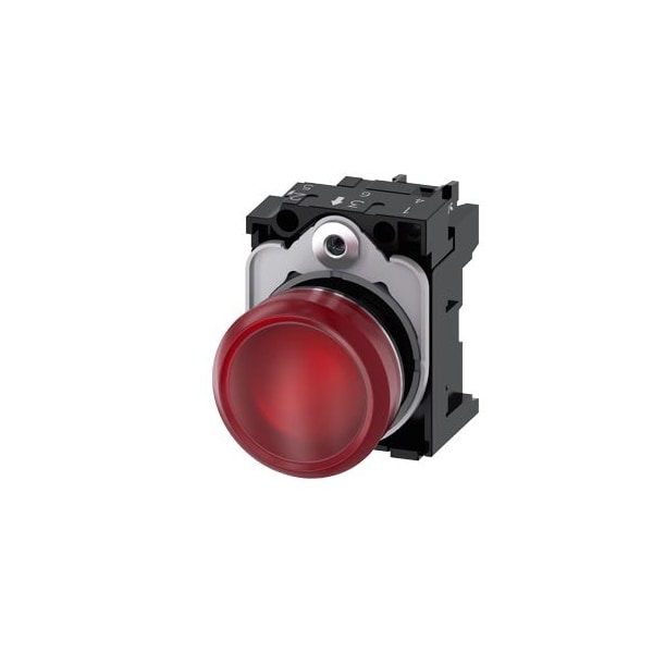 Indicator lights, 22 mm, round, metal, shiny, red, lens, smooth, with holder, LED module with integrated LED 24 V AC/DC, screw terminal, with laser labeling, symbol number according to, ISO 7000 or IEC 60417