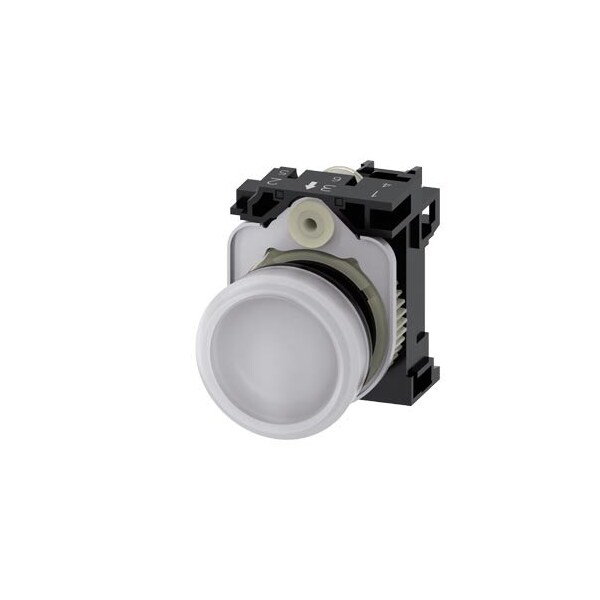 Indicator lights, 22 mm, round, plastic, white, lens, smooth, with holder, LED module with integrated LED 110 V AC, screw terminal, with laser labeling, upper case and lower case, always upper case at the beginning of the word