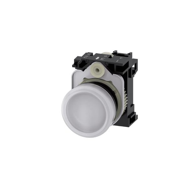 Indicator lights, 22 mm, round, plastic, white, lens, smooth, with holder, LED module with integrated LED 110 V AC, screw terminal