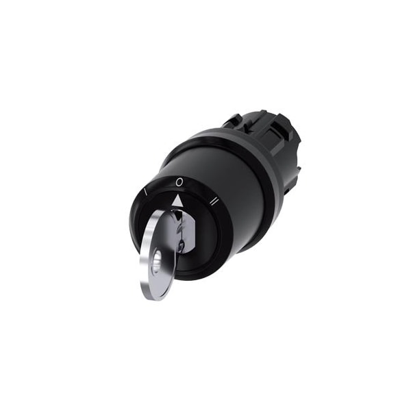 keyswitch Siemens, B, 22 mm, round, plastic, lock number S1, with 2 keys, 3 switch positions IOII, momentary contact type on the left, latching on the right, actuating angle 2x45°, 10:30h/12h/13:30h, key removal O, with laser inscription, in upper case