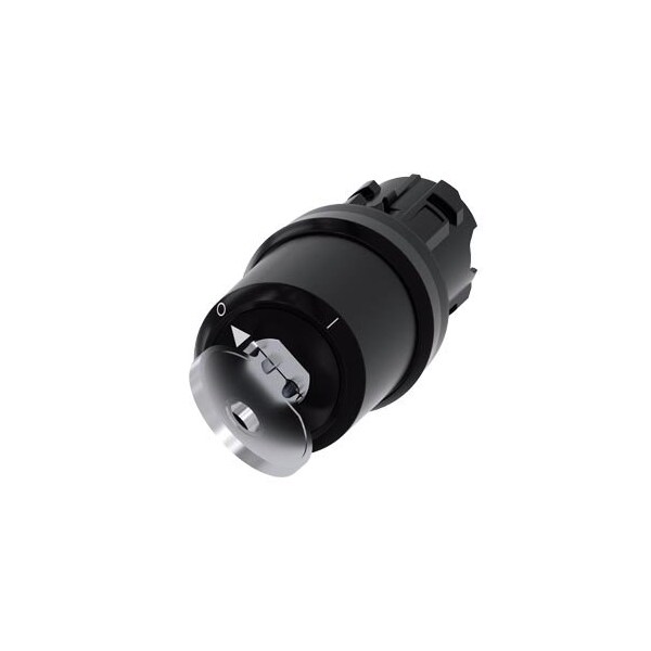 keyswitch Siemens, B, 22 mm, round, plastic, lock number E7 VW, without key, 2 switch positions O-I, latching, actuating angle 90°, 10:30h/13:30h, key removal O, with laser inscription, upper case and lower case, always upper case at beginning of line